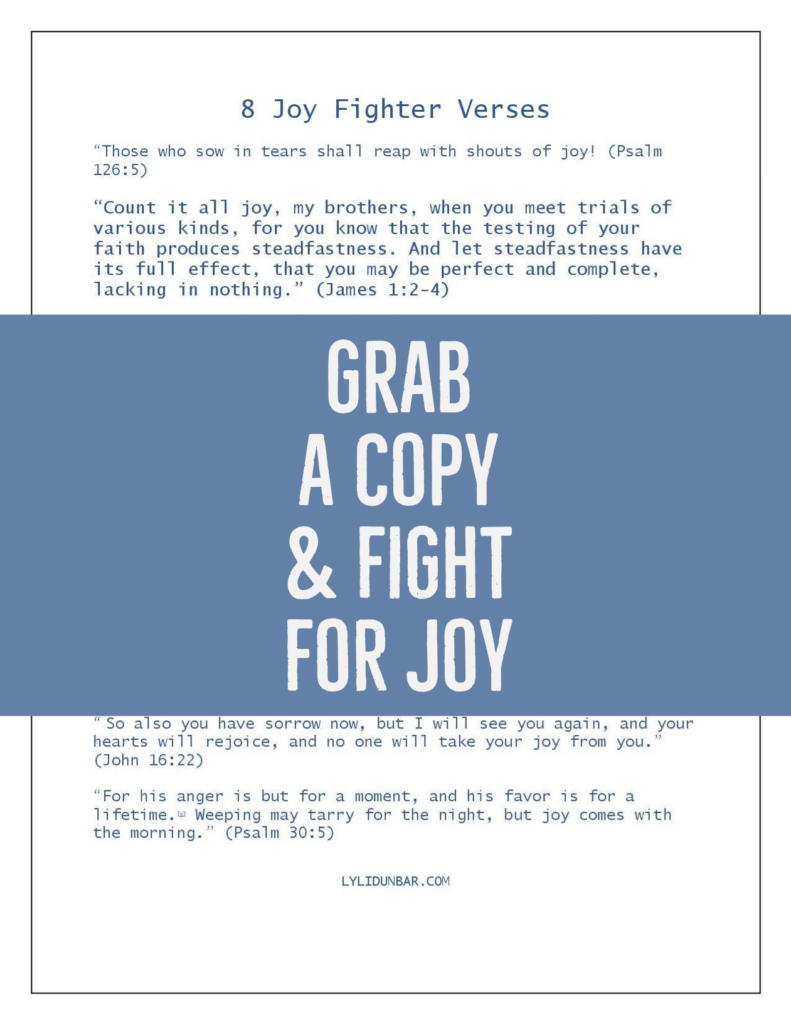 Need more help remembering God clothes you with joy? Iโve created a one-page printable with 8 Joy Fighter Verses to help you get started. Download a copy and read through these sweet promises every morning to remind you the joy of the Lord is your strength. Sign up today as a member of the Wildfire Faith Community and grab a copy in our Faith Fuel Library.. Sign up today as a member of the Wildfire Faith Community and grab a copy in our Faith Fuel Library.